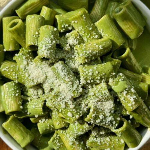 I am big on my meals being protein-forward making this creamy spinach pasta a winner because I don’t have to thaw or cook any meat, but can get a decent amount of protein from the sauce alone! However, if available, I love to add a grilled chicken breast or some chicken meatballs for a very hearty & satiating meal!