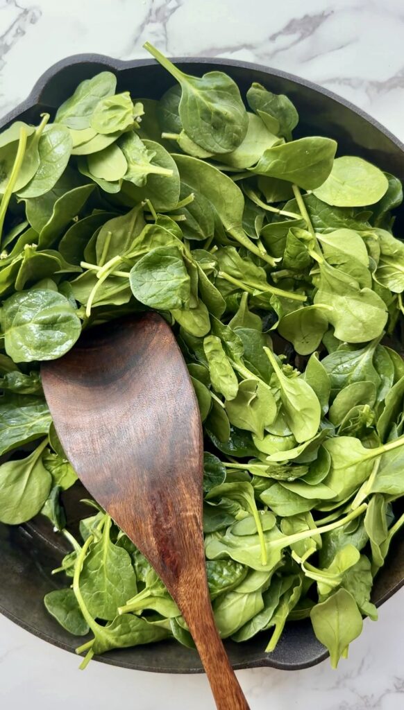- In a medium skillet, heat a drizzle of olive oil over medium heat. Add the spinach and sauté until wilted, about 2–3 minutes.