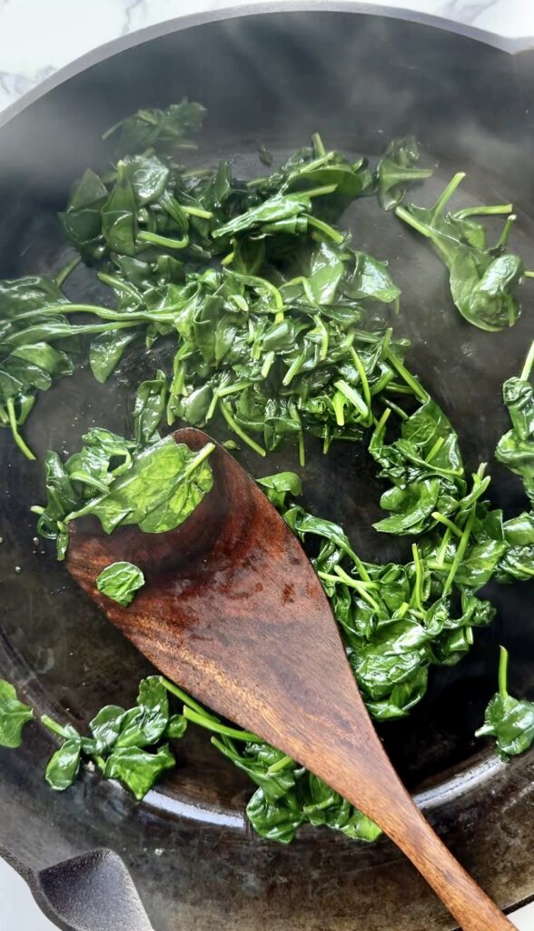 - Sauté the spinach in a skillet with a drizzle of olive oil until wilted. This can be done while the pasta is cooking.