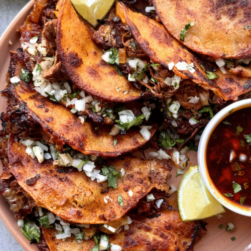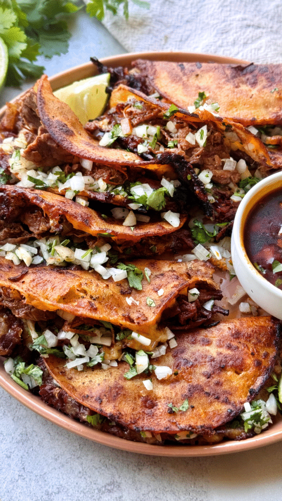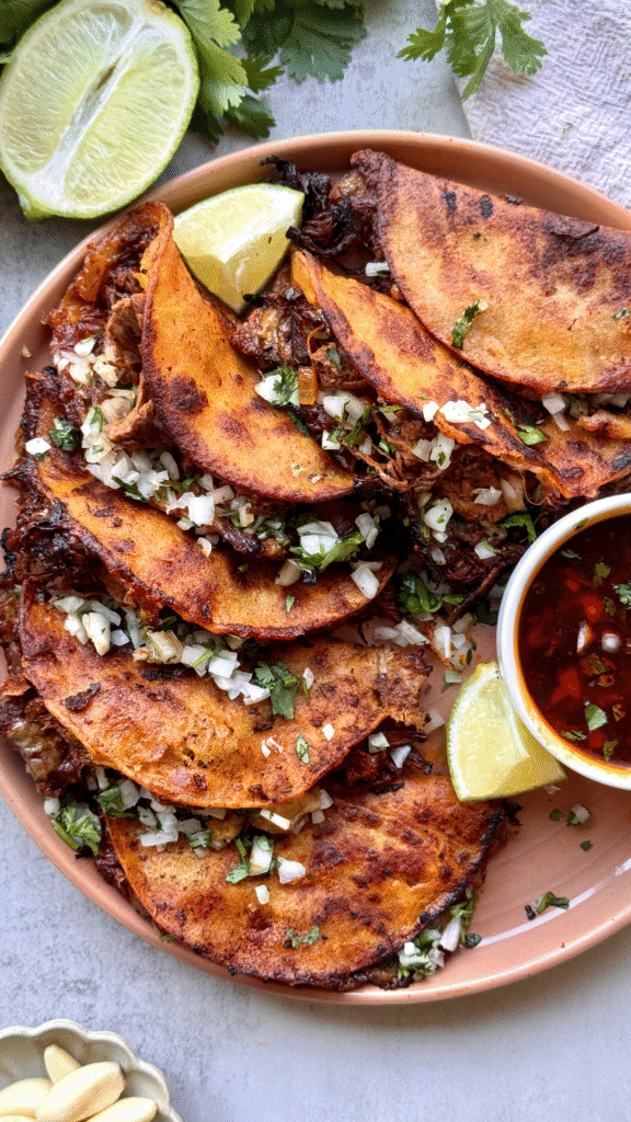 Make these birria tacos your own — add avocado or pickled red onions for freshness. Serve them alongside rice and beans, or a crisp slaw, or keep it simple with lime and cilantro.