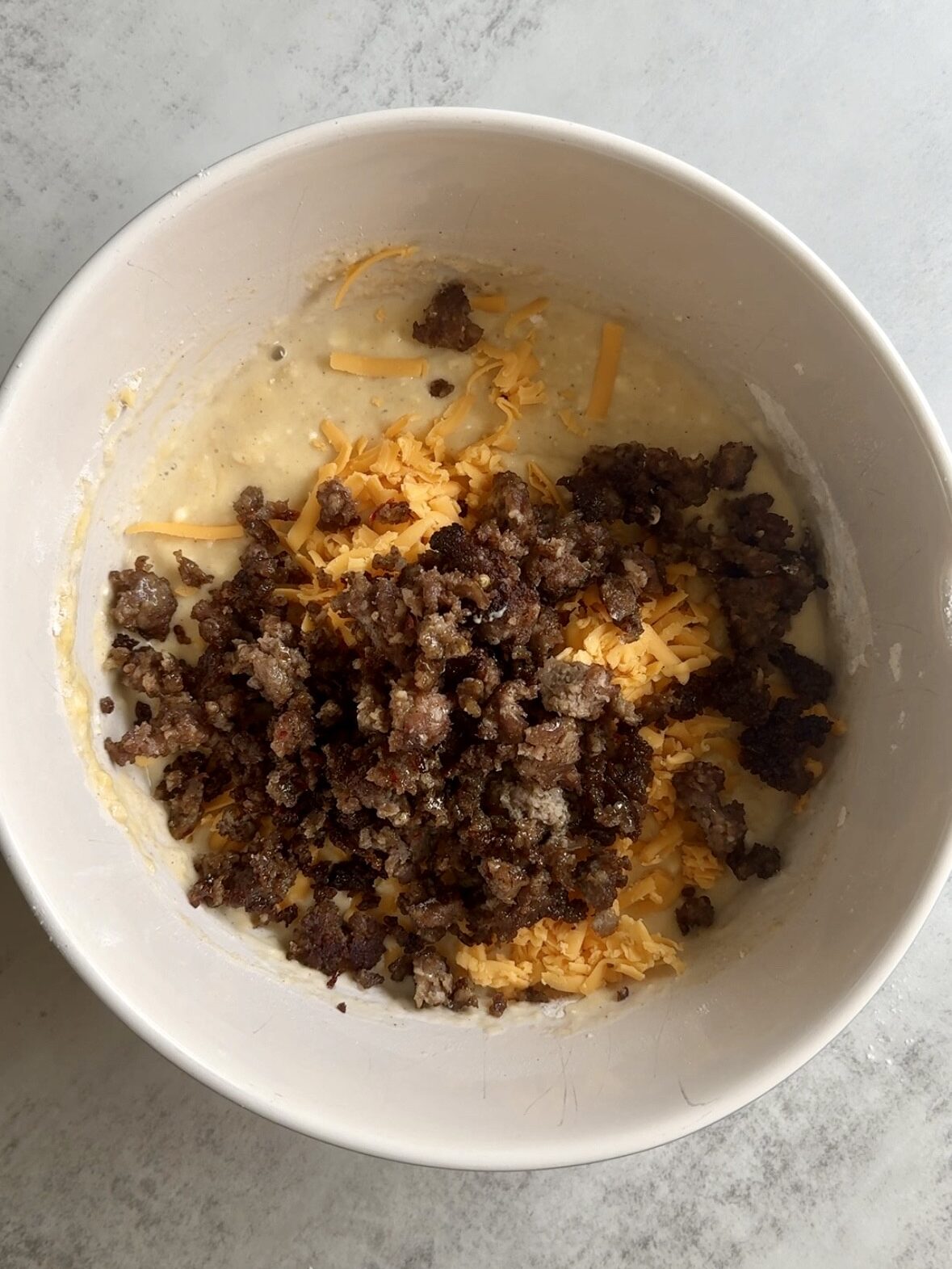 - In a large bowl, whisk together the flour, baking powder, eggs, cottage cheese, milk, and maple syrup until the mixture is smooth and well combined. Fold in the cooked sausage and shredded cheese.