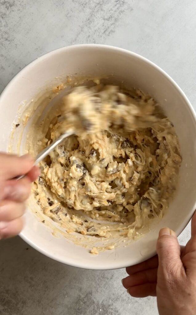 - Mix in sausage and cheese making sure the sausage has cooled. Hot sausage can alter the baking process.