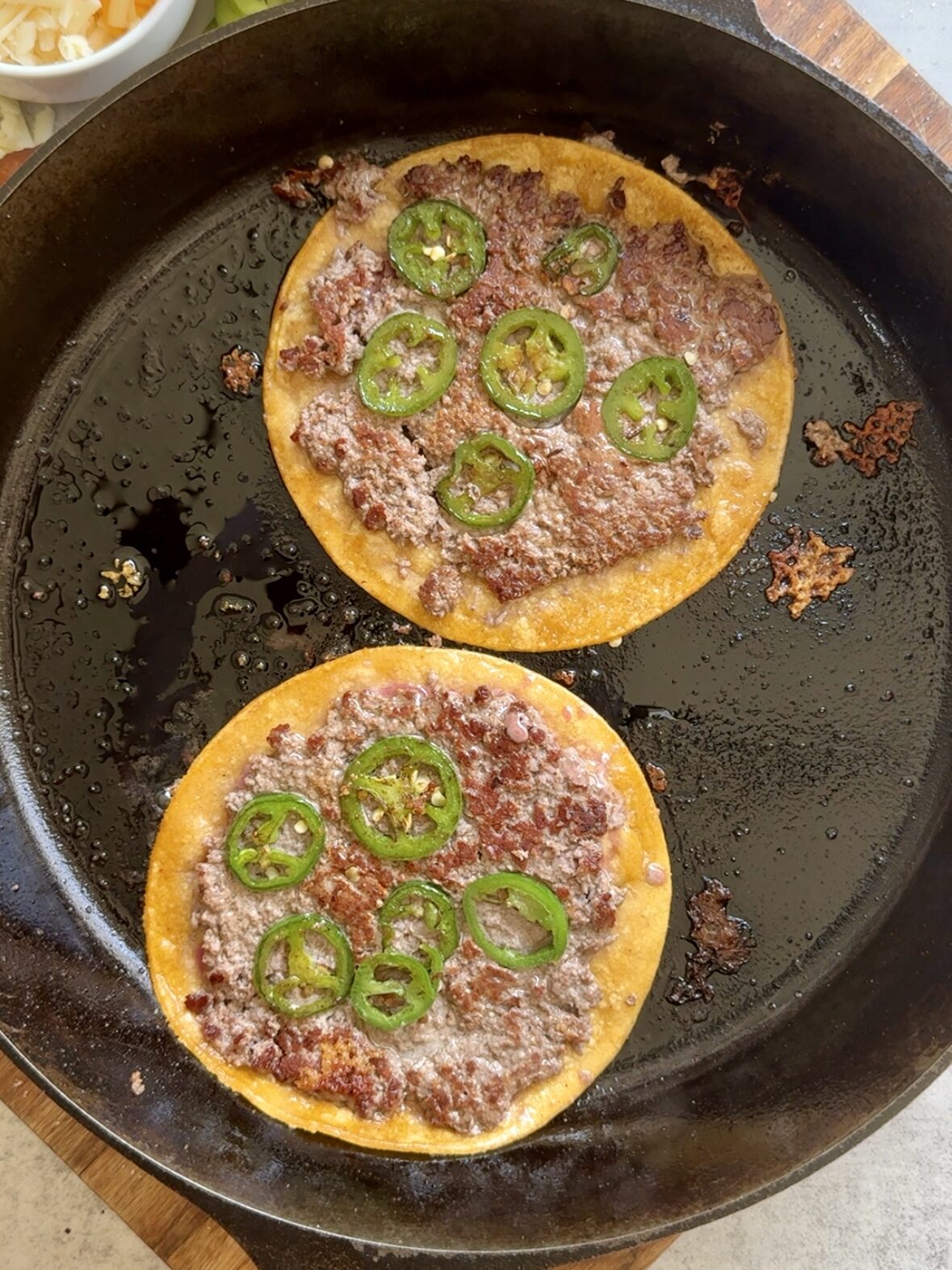 - Wipe out the skillet and add a little more oil. Arrange five jalapeño slices directly in the pan for each taco, then carefully place a prepared tortilla, beef side down, over the jalapeños. Press down gently to smash the beef into the pan. Cook for about 2 minutes, or until the beef is browned and crisp. Flip the taco, sprinkle with shredded cheese, and cook for another 2 minutes until the cheese is melted and the tortilla is golden.