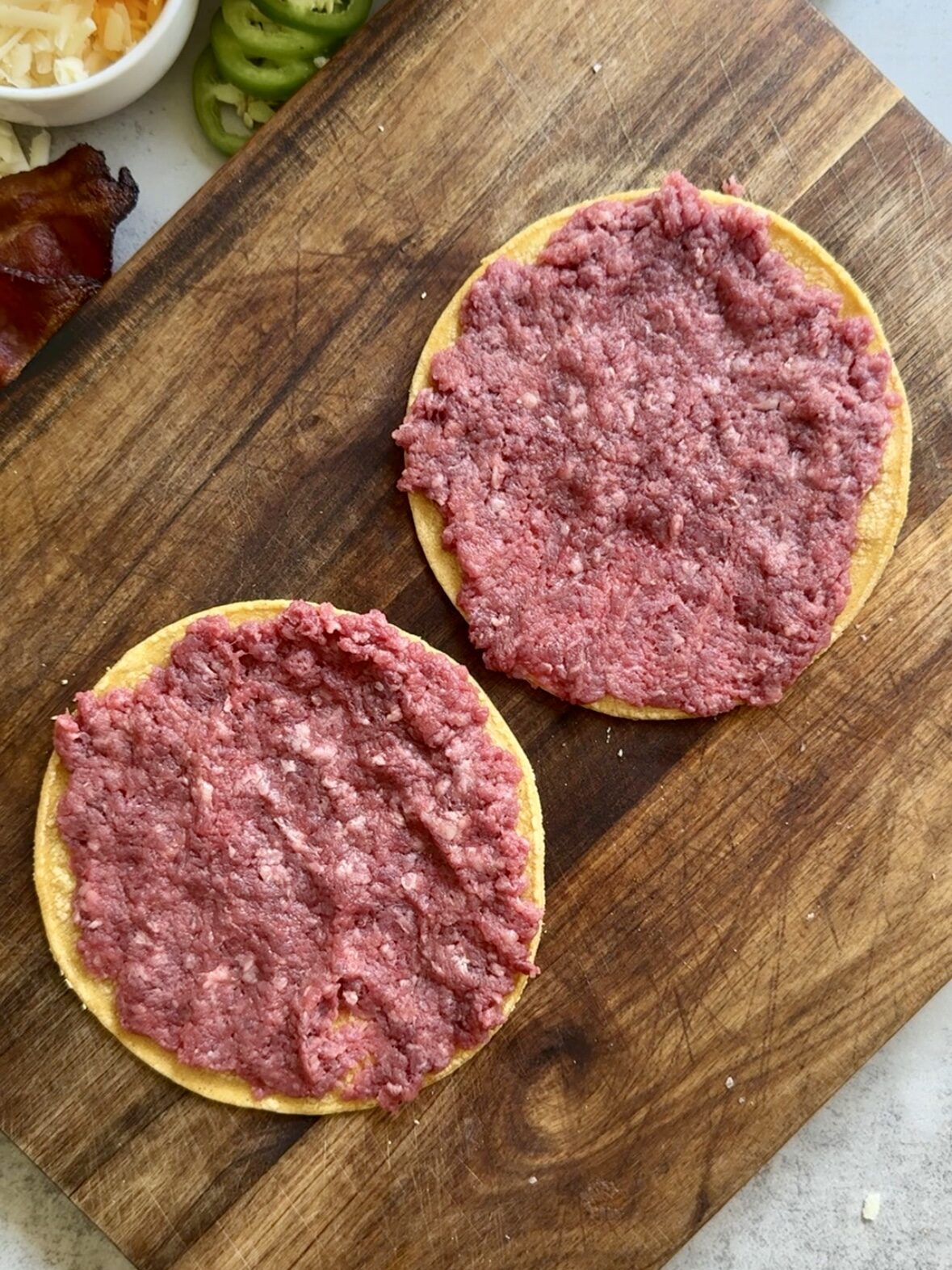 - Divide the ground beef into 6 equal portions. Press the ground beef evenly onto the corn tortilla, spreading it all the way to the edges—season with salt & pepper.