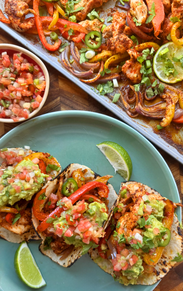for a step-by-step tutorial of my sheet pan chicken fajitas, watch my video on Instagram