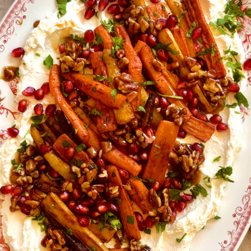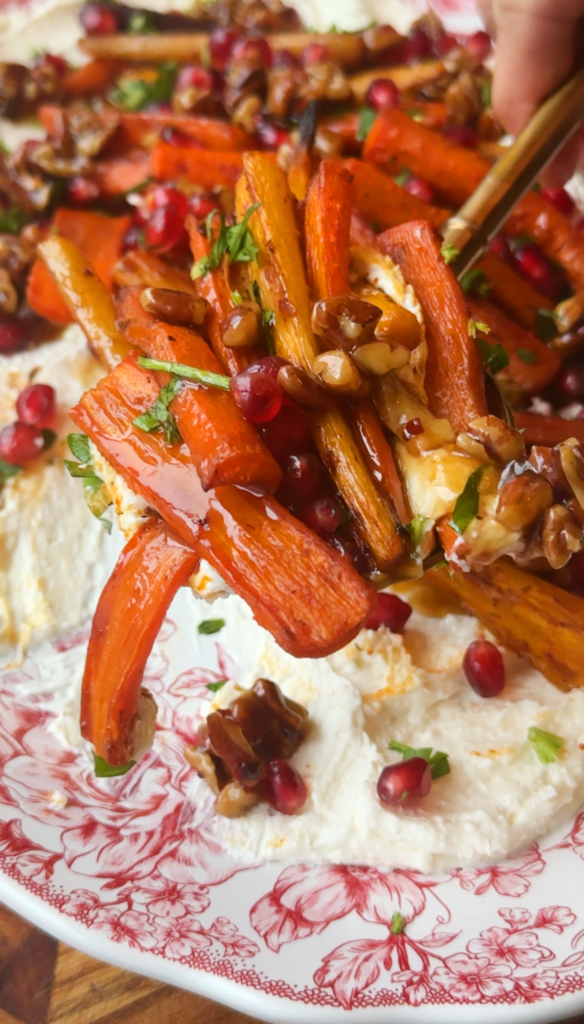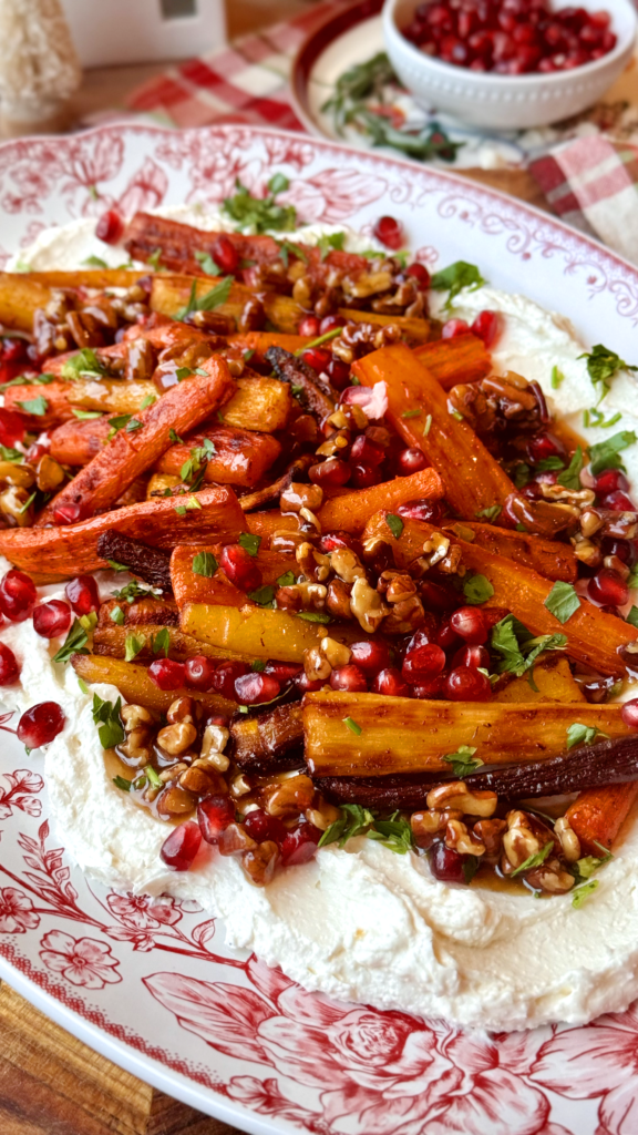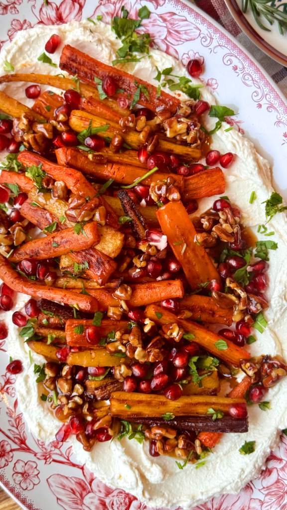 This roasted carrot dish will turn even the biggest carrot naysayer into a carrot lover, guaranteed! I’m a big fan of carrots—they’re true nutrient powerhouses packed with fiber, antioxidants, and essential vitamins, but I especially love them roasted. The carrots get beautifully caramelized in a maple-spiced glaze, the whipped feta adds a creamy, tangy contrast, and the candied pecans and pomegranate seeds bring the perfect crunch with little pops of sweetness that make the whole dish shine.